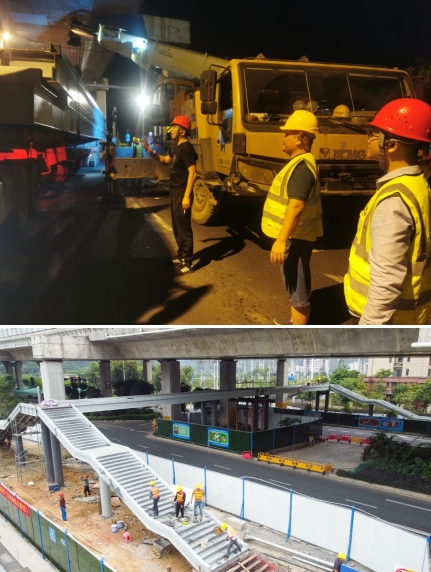 由于人行天橋項目建設所處的位置地下含高壓線等管線,施工環(huán)境較為復雜,且又處在交通通行量大的東環(huán)高速高架橋下,由于空間受限,鋼箱梁吊裝與高架橋最近的距離僅有5公分,吊裝難度極大。為此,我們采取雙吊車協(xié)同施工、錯峰施工和夜間施工的辦法。為確保施工安全,市政集團從上至下高度重視,由集團領導帶隊,項目總工及各職能部門主要人員齊上陣,從交通協(xié)調(diào),運梁車跟隨指導,安全措施落實及現(xiàn)場架梁的線位等多方面進行把控,主要負責人靠前指揮,帶領黨員干部及時協(xié)調(diào)解決吊裝過程中遇到的問題,充分發(fā)揮出黨支部戰(zhàn)斗堡壘和黨員的模范帶頭作用。