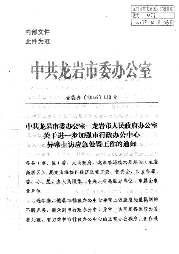市委辦關(guān)于進(jìn)一步加強(qiáng)市行政辦公中心異常上訪應(yīng)急處置工作的通知(巖委辦【2017】110號)